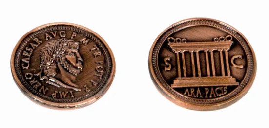 Set of ten Roman-themed, officially licensed metal coins by Fantasy Coins LLC. These heavy-weight, finely-minted coins are crafted from zinc and nickel with high-relief 3D detailing and a hand-buffed copper finish.