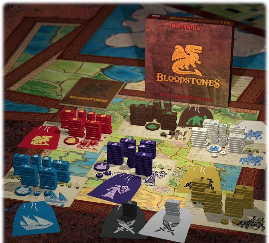 Bloodstones is a fantasy wargame for one to six players, featuring six different races, each with their own specific powers. Each of the six races in Bloodstones has its own mix of units, represented by domino shape tiles. Some of these units will be unique to that race, such as Dragons to the Dragon Riders and Giants to the Hill Folk.