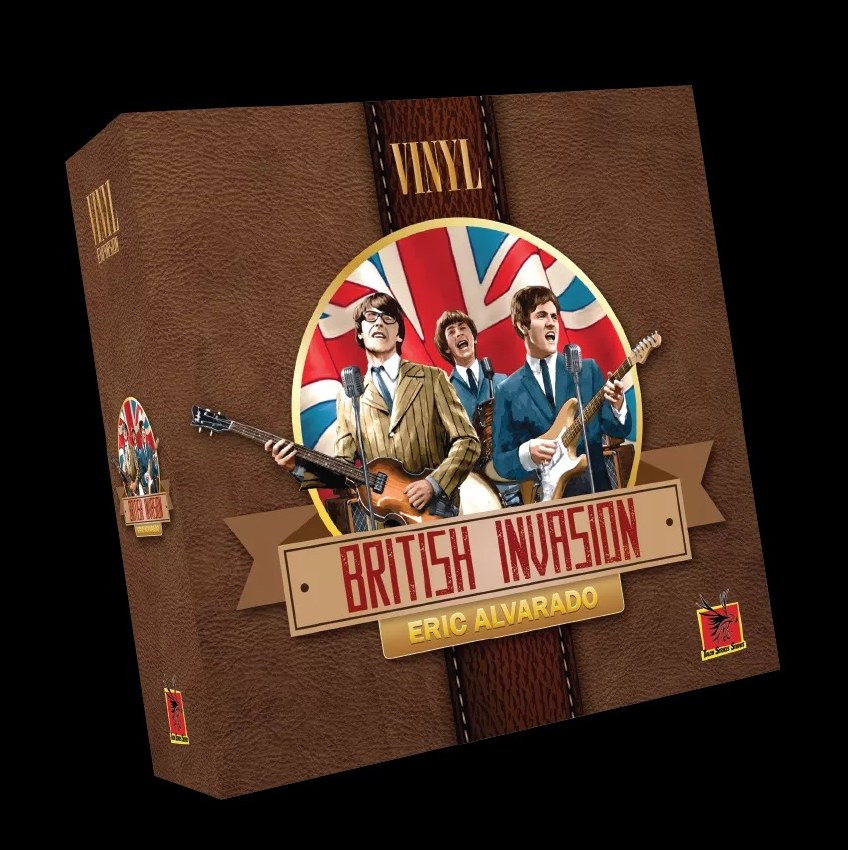 Vinyl British Invasion is a stand-alone Vinyl edition that builds on the base game of Vinyl and introduces the listening booth and singles (aka 45s). Historically, 45s were purchased to initially and eventually encouraged buyers to acquire the associated LP album or even another album from the band. In BI, players can acquire 45s by matching the band icon. Each 45 has an "A-side" with locked attributes that can be unlocked at the Listening Booth. At the Listening Booth, players will discard a magazine card with one matching icon to flip the 45 to its "B-side" giving the player more points and the opportunity to use the 45 to acquire LPs with similar attributes in future rounds.