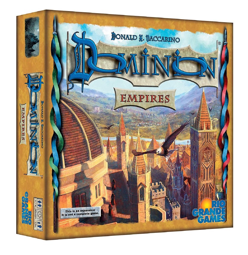 Dominion: Empires, the tenth addition to the game of Dominion, contains 96 metal tokens and 300 cards, with cards you can buy now and pay for later, piles with two different cards, and Landmarks that add new ways to score. VP tokens and Events return from previous sets.